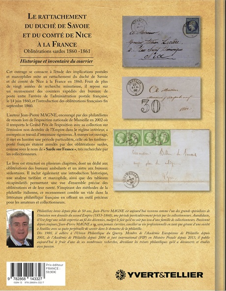 The author Jean-Pierre Magne, encouraged by renowned philatelists at the national exhibition in Marseille in 2002, undertook this rigorous inventory work. Through this work, he highlights a particular period, the one when French stamps were cancelled by Sardinian obliterations, known as «Sarde sur France», very sought after by collectors.